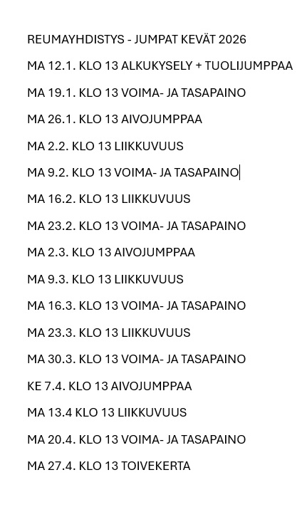 Kevään toimintaa löytyy Keikkakalenterista ja Jumppa ohjelmasta.